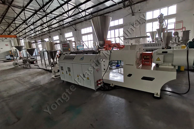Im Jahr 2024 haben wir für einen polnischen Kunden eine maßgeschneiderte Pelletiermaschine für PVC-Compounds entwickelt, die speziell für die Herstellung von PVC-Masterbatch-Granulat aus recyceltem PVC und CaCO₃-Füllstoff konzipiert ist. Der CaCO₃-Füllstoffgehalt kann flexibel zwischen 40 % und 80 % angepasst werden, um ihn an die Produktionsspezifikationen des Kunden anzupassen. Zu den Schlüsselkomponenten gehören eine automatische Zuführung, ein konischer Doppelschneckenextruder SJSZ80/156 (75-kW-Motor mit ABB-Frequenzumrichter, der bei stabilem Betrieb etwa 50 kW verbraucht), eine Heißpelletierdüse für gleichmäßiges Granulatschneiden und ein dreistufiges schnelles Luftkühlungs- und Fördersystem aus Edelstahl 304. Die Maschine erreicht eine Produktionskapazität von 300–400 kg/Stunde und ist für den Dauerbetrieb rund um die Uhr ohne Ausfallzeiten ausgelegt. Die Installation verlief reibungslos und wurde vom Expertenteam von Yongte unterstützt, das umfassende Unterstützung leistete. Nach der Installation wurden die Mitarbeiter des Kunden durch eine Vor-Ort-Schulung in die Lage versetzt, die Geräte kompetent zu bedienen, während der technische Fernsupport per Videoanleitung eine schnelle Lösung aller Probleme sicherstellte und eine unterbrechungsfreie Produktion und Spitzenleistung aufrechterhielt.